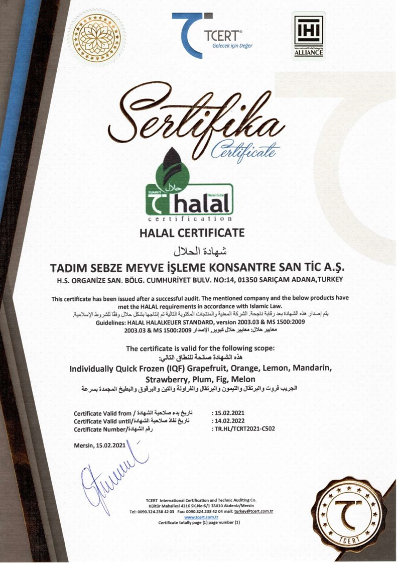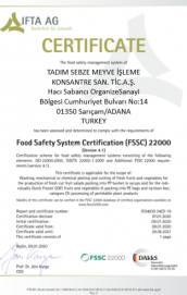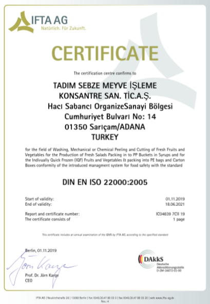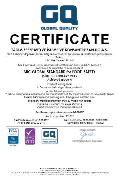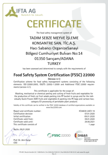 Hammadde temininden başlayarak müşteriye kadar olan tedarik zincirinin tüm halkalarında, gıda güvenliğini garanti edecek her türlü hijyenik üretim koşullarının sağlanması, tüketici sağlığının ve memnuniyetinin ön planda tutularak, yasal tüm şartlara uyularak üretim yapılması her “TADIM Sebze Meyve İşleme ve Konsantre San. Tic. A.Ş.” çalışanının temel sorumluluğudur .