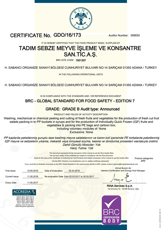 A Tadim la sécurité alimentaire est notre priorité, et notre programme est audité régulièrement par les autirités Turques. Tadim s’est engagé à avoir un standard qualité le plus exigeant en Turquie, pour cela nous nous dotés d’un excellent système d’enregistrment, avec des prises de mesures à chaque étape du process, ceci pour garantir la fraicheur et la sécurité à nos produits